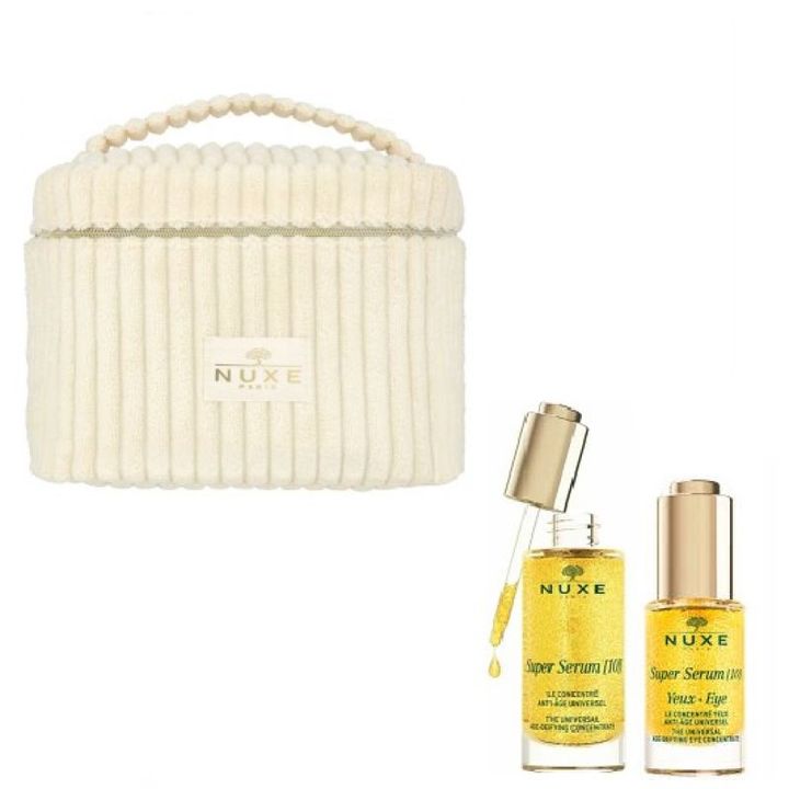 El kit NUXE Rutina Super Serum incluye una combinación efectiva de productos diseñados para revitalizar y cuidar la piel del rostro y el contorno de ojos. El Super Serum [10] es un concentrado anti-edad que reduce visiblemente las arrugas, mejora la firmeza y aporta luminosidad, mientras que el contorno de ojos actúa específicamente para disminuir bolsas y ojeras, aportando frescura y suavidad a la mirada. Formulados con ingredientes naturales y tecnología avanzada, estos productos ofrecen una rutina completa para una piel más joven, tersa y radiante, ideal para quienes buscan un cuidado intensivo y resultados visibles desde las primeras aplicaciones. El kit contiene : - 1 Super Serum [10] El concentrado antiedad universal 30 ml - 1 Super Serum [10] Contorno de ojos - El concentrado para el contorno de ojos antiedad universal 15 ml y un estuche 100% lino.